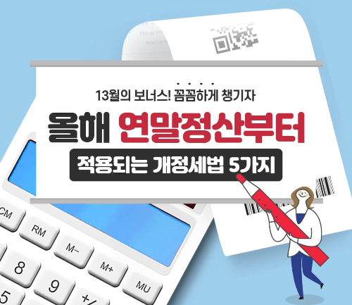 올해 연말정산부터 새로 적용되는 주요 개정 세법 내용을 정리했으니, 각종 공제항목을 꼼꼼히 챙겨 실속 있는 연말정산을 준비하시기 바랍니다.